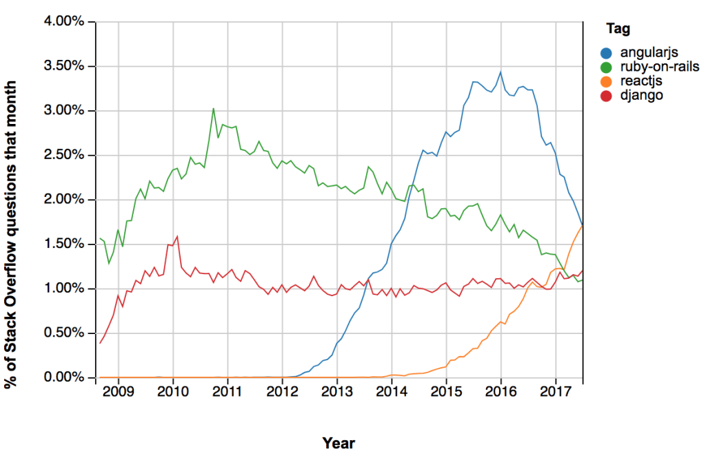 The curve below shows the evolution of the number of subjects opened on Stack Overflow since the creation of the platform on the 4 Frameworks Django, Angular, React and Ruby on Rails: